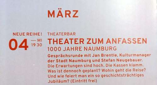 Zwei Termine im März, die man sich schon einmal in den Kalender schreiben sollte: Am Mittwoch, dem 4.3. lädt das Theater zu einem neuen Format ein, „Theater zum Anfassen“ genannt. Diesmal im Programm eine Gesprächsrunde mit Intendant Stefan Neugebauer und dem 1000 Jahre Manager der Stadt, Jan Owe Brentle über den Stand der Vorbereitungen und Perspektiven zum Stadtjubiläum 2028. Diese findet in der Theaterbar statt und der Besuch ist für alle Interessierten kostenfrei. — Und wie im Februar so auch im März wieder an einem Donnerstag und wieder an einem 19.: Das 1000mal Naumburg Plenum des Bürgervereins im AUH, Wenzelsgasse 9, wie immer mit spannenden Themen und Projekten zur 1000 Jahrfeier