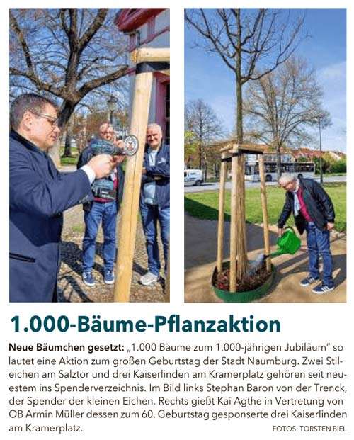 Welche Projekte und Aktionen im Zusammenhang mit unserem großen Stadtjubiläum bereits im Gange sind, ist auch auf dieser Internetseite ablesbar. Zu den zahlreichen Unternehmungen, die auf das Jubeljahr hinführen, gehört die Initiative „1.000 Jahre – 1.000 Bäume“, die mir besonders am Herzen liegt. Bis 2028 sollen mittels Spenden aus der Bürgerschaft 1.000 neue Bäume in Naumburg gepflanzt werden.