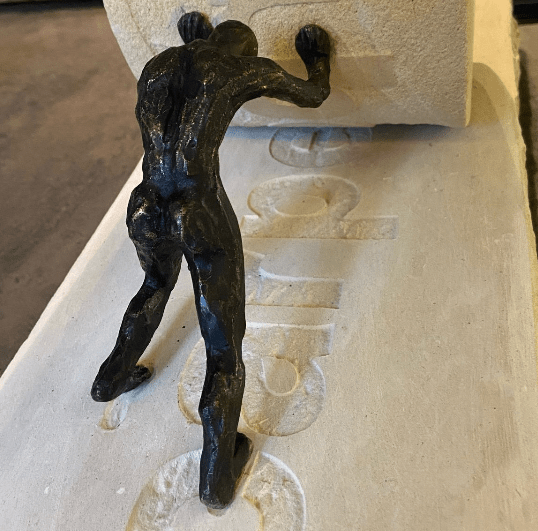 In einem Zeitungsinterview las ich, dass er ein weiteres Puzzlestück für Naumburg plant, die Idee zu der Bronzeplastik hat er schon länger und mir fiel beim Lesen des Artikel auf, dass ich vor längerer Zeit von einem der ersten Modelle einen kleinen Schnapsschuss gemacht hatte. Nun gibt es einen möglichen Sponsor, das Werk steht auf der Prioritätenliste des Künstlers und ein Ort im Rahmen von „1000 Meter Kunst“ zu finden wird der nächste Schritt sein. Roland Lindner möchte es noch nicht an die große Glocke hängen, aber das Projekt unter dem Arbeitstitel „Wann, wenn nicht jetzt“ nimmt nun konkrete Formen an. Es zeigt einen Mann, der eine Kugel die Rampe hochrollt oder, umgekehrt betrachtet, mit den Händen aufhält.
