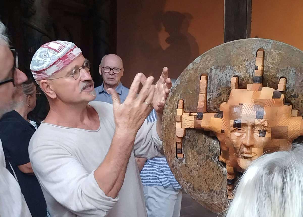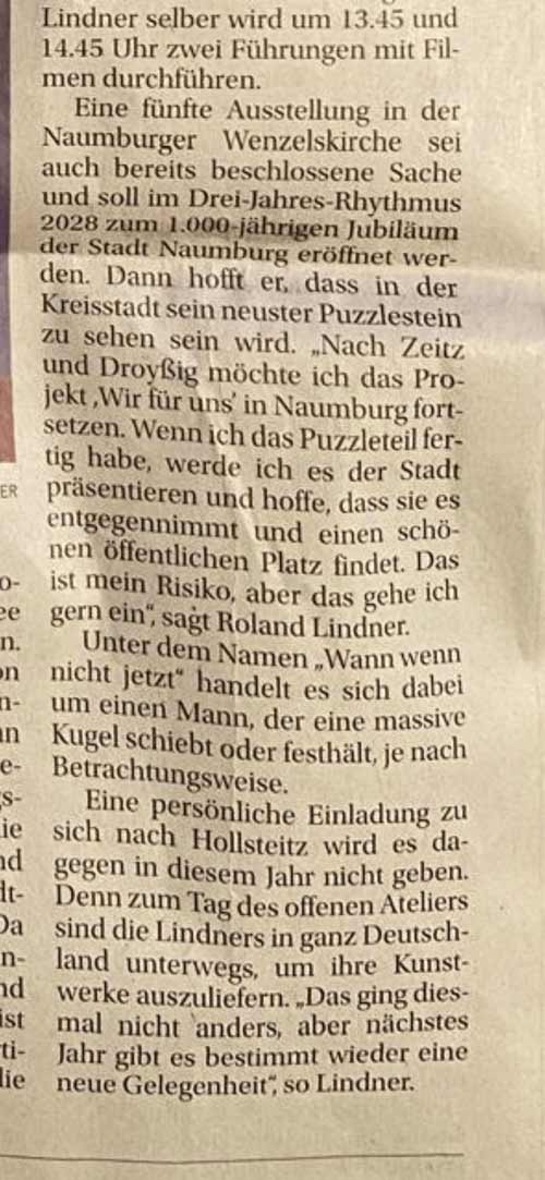 Auf dem Weg nach Zeitz, in dem kleinen Ort Hollsteitz zur Linken der Bundesstraße, lebt und arbeitet der Künstler Roland Lindner und seine Frau Kerstin. In Naumburg ist er kein Unbekannter. Seine allererste Ausstellung am Anfang seiner Künstlerkarriere fand in der Naumburger Ideenschmiede Mitte der 90er Jahre statt. In diesem Jahr stellt er zum vierten Mal in der Wenzelskirche aus, im Turnus von drei Jahren. Die diesjährige Ausstellung mit teilweise großformatigen Arbeiten aus Holz, Bronze und Stein ist übertitelt: Endlich(e) Zeit. Man mag gespannt sein, wie in drei Jahren zur 1000 Jahrfeier seine Ausstellung thematisiert sein wird. Auf jeden Fall hat Roland das Stadtjubiläum auf dem Schirm, den Diskurs in gemeinsamen Gesprächen über Kunst im Raum im Jahre 2028 haben wir schon vor zwei Jahren begonnen.