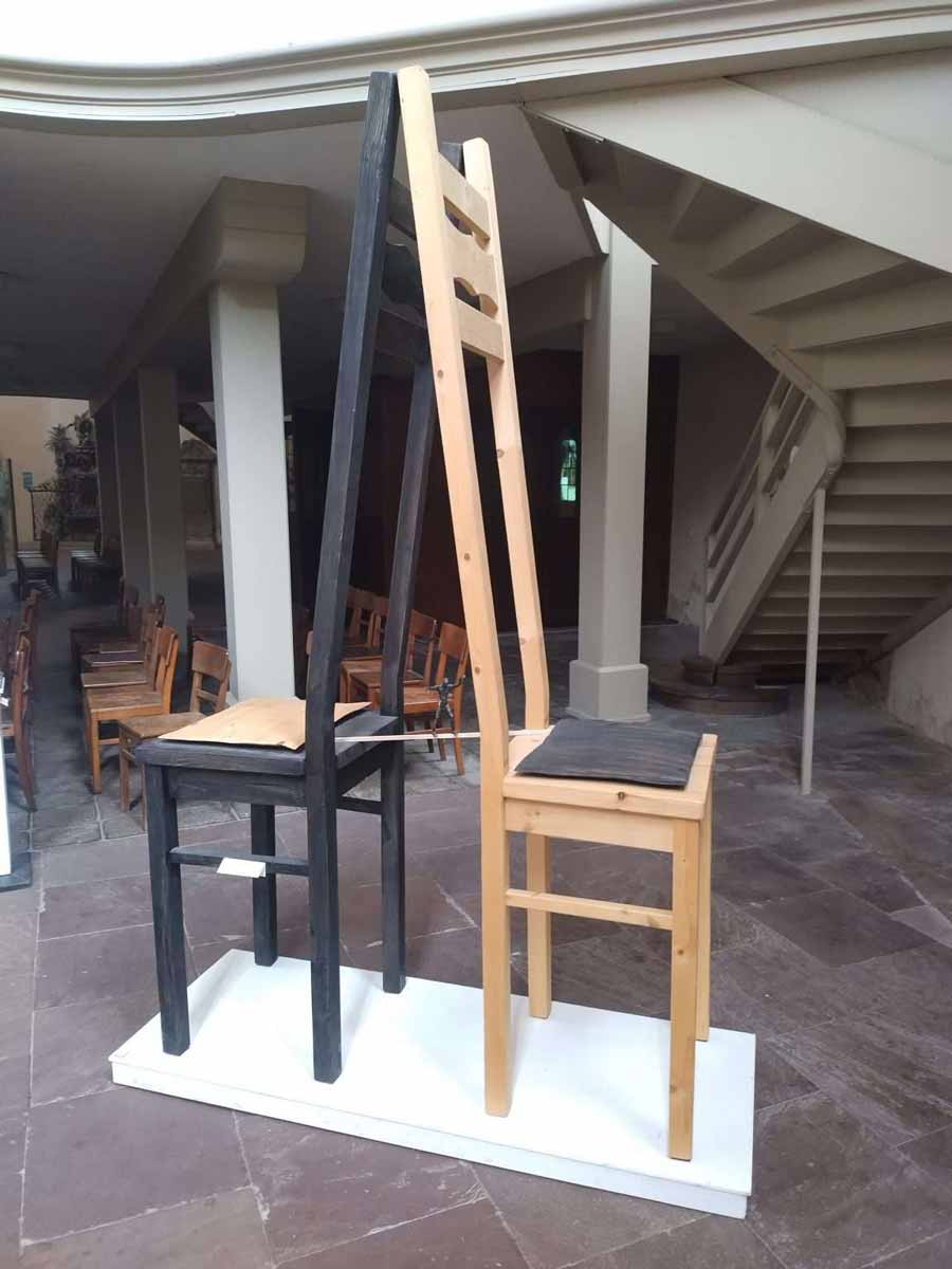 Er ist Teil der Marketingaktion „Wir sind Zeitz“ und hat dort eine Reihe von Kunstwerken im öffentlichen Raum realisiert. Hat er eine Idee für ein Kunstwerk in Verbindung mit einem konkreten Standort geht er in Vorleistung. Er schafft erst das Kunstwerk und dann sucht er einen Mäzenen, der es ermöglicht, dass das Kunstwerk aufgestellt wird. So sind in Zeitz eine Reihe von Kunstwerken in den vergangenen zehn Jahren zusammen gekommen, Puzzlestücken gleich ergeben sie ein Gesamtkunstwerk und haben die öffentliche Hand keinen einzigen Euro gekostet. Sein Credo „Zwischen einem Traum und dem Ziel liegt die Tat“ ist sicherlich anderes gemeint, aber man kann es auch auf diese Herangehensweise herunterbrechen. Aber nicht nur in Zeitz und Umgebung stehen seine Kunstwerke, es gibt Dauerausstellungen an der Ostsee und in der Droyssiger Schlosskirche hängt ein überdimensionales Pendel an der Wand, sein letztes Puzzlestück, finanziert von einem süddeutschen Mäzenen, mit dem er seit Jahren befreundet ist. Sein „Wir für uns“ kommt Zen buddhistisch herüber, es ist nicht der Künstler oder seine Kunst isoliert, sondern immer das Zusammenspiel mit dem Ort und dem jeweiligen Betrachter, aber auch der Person, die dies alles ermöglichte.