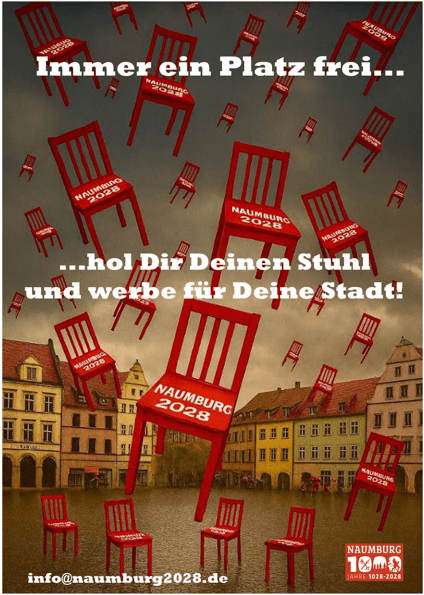 - Am Dienstag, dem 7.10. zwischen 15.00 & 18.00 Uhr auf dem Markt: Vorstellung der Marketing-Aktion "Immer ein Stuhl frei.." mit den ersten Stühlen, die für 1000 Jahre Naumburg werben. Wer einen alten Stuhl hat, möge ihn mitbringen. Es werden der ein oder andere Stuhl in Stadtfarben rot/weiß lackiert werden. Wer für diese Aktion, die von acht Naumburger Vereinen und Initiativen begleitet wird, eine Spende übrig hat: DE66 800 530 00 30 120 120 00 Bürgerverein (Vermerk: Immer ein Stuhl frei)