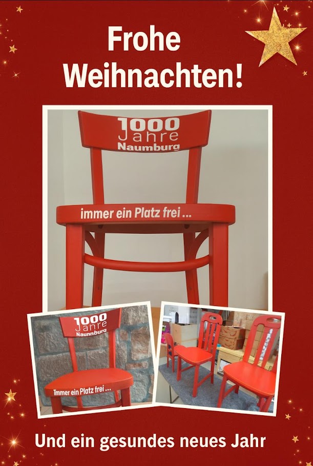 Nun ist es höchste Eisenbahn für ein paar Jahresendgrüße an Euch, liebe Leser, die Ihr durchschnittlich 5000mal im Monat (am 3. Oktober sogar an einem Tag) diese Seite besucht habt. Bleibt weiterhin neugierig und gespannt, was im Vorfeld der Vorbereitungen zur 1000 Jahrfeier der Welterbe- & Domstadt Naumburg zu berichten sein wird. Hier gleich zwei Termine im neuen Jahr, beide im AUH in der Wenzelsgasse 9: Am Donnerstag, dem 8. Jan. jeweils um 11.00 wie um 16.00 Uhr findet der 4. Stuhlgang statt, Stühle 70 - 80 werden umlackiert werden. Hilfe ist gern gesehen. Und am 22. Jan. um 17.00 Uhr ist das erste 1000mal Naumburg Plenum des Bürgervereins. Prominenz hat sich angekündigt, es gibt einen aktuellen Lagebericht und Ad van de Kouwen wird von interessanten Aktionen zur 750 Jahrfeier in seiner niederländischen Heimatstadt erzählen. Bis dahin, wir sehen uns!